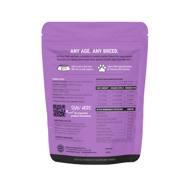 - Bột bổ sung cho chó này được các chuyên gia trên khắp nước Úc sử dụng, giúp chó thư giãn trong những tình huống chúng cảm thấy căng thẳng.
