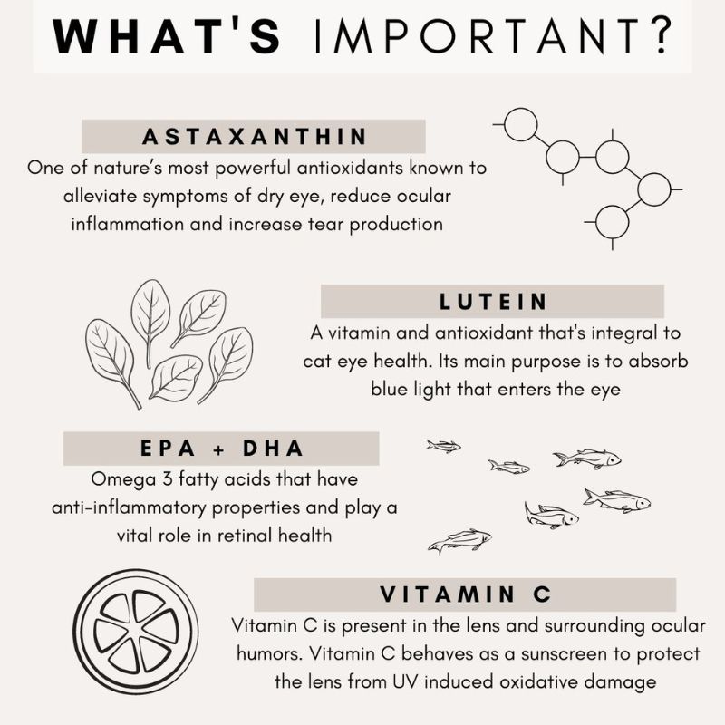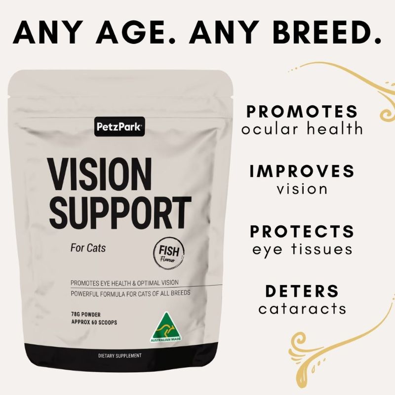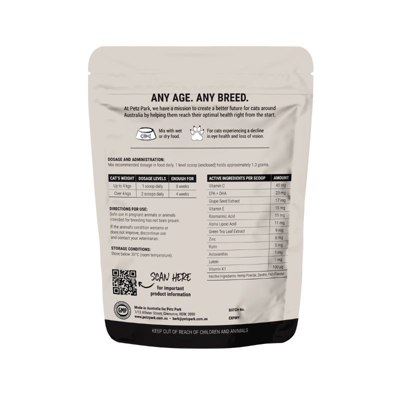- Eye Support dành cho mèo được thiết kế để cải thiện thị lực, ngăn ngừa đục thủy tinh thể và duy trì sức khỏe tổng thể của mắt mèo.